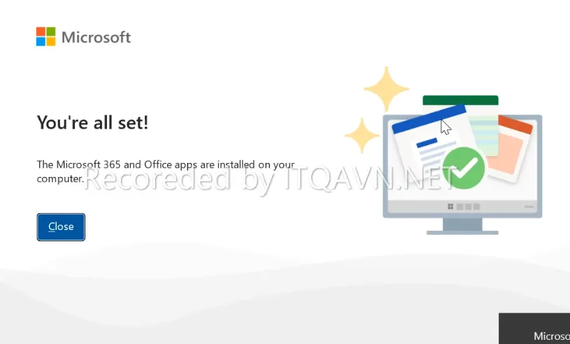 Bước 5. Bạn chờ quá trình cài Office 2021 trên Windows diễn ra cho đến khi nhận được thông báo You’re all set ! The Microsoft 365 and Office apps are installed on your computer, khi đó bạn đã cài đặt Office 2021 trên Win 11, Win 10 thành công