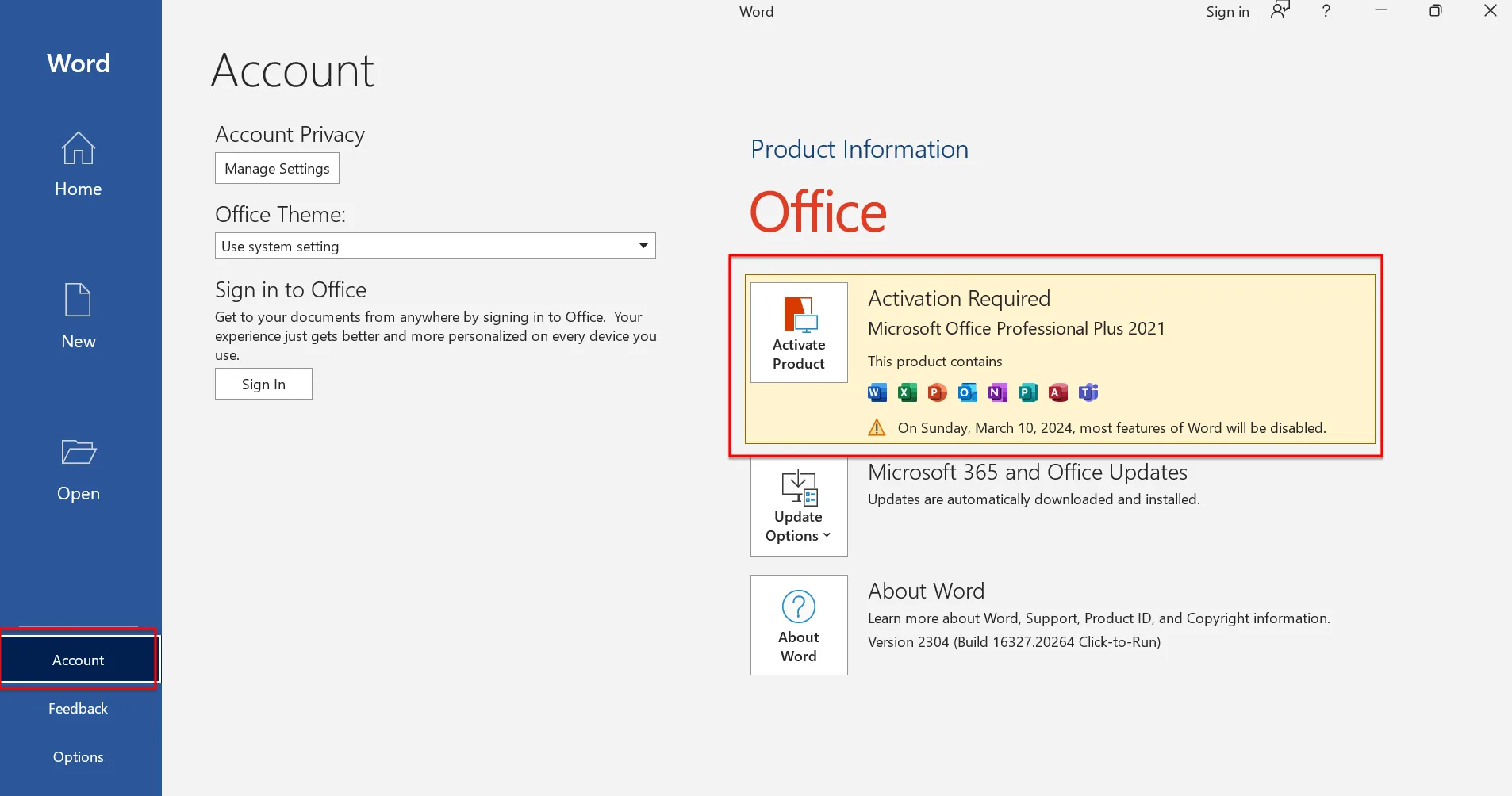 Bước 6. Tiếp theo bạn mở Word hay bất kỳ phần mềm nào trong bộ Office 2021, sau đó chọn vào mục Account để xem phiên bản Office 2021 trên Windows 11, Windows 10